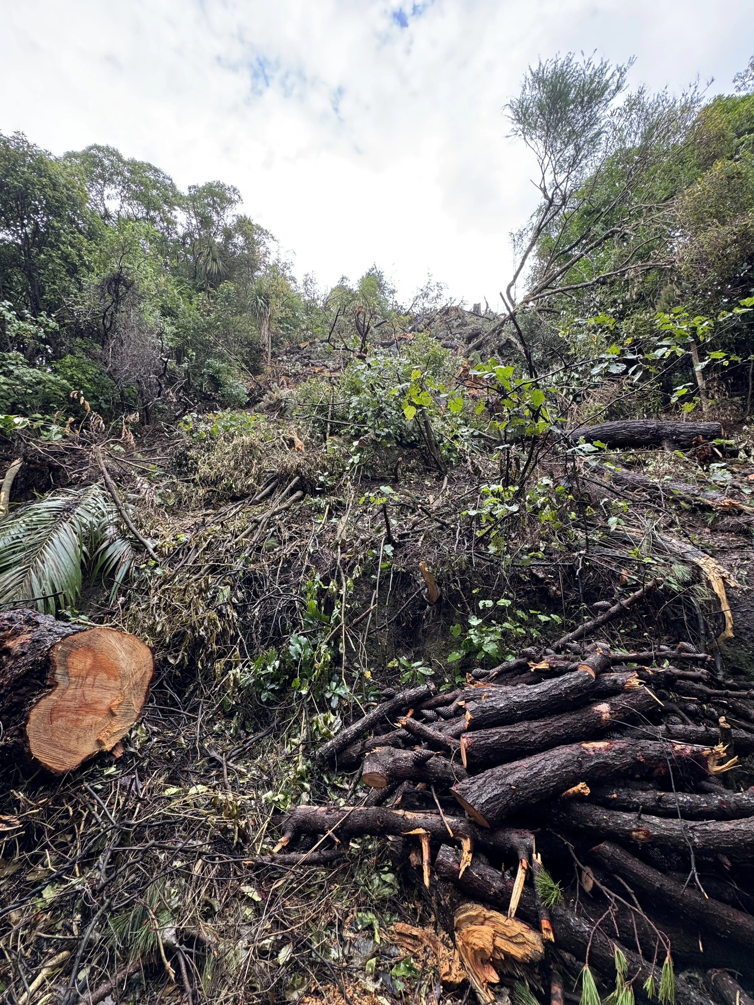 It’s about a 25 minute walk from my home to Manawa Karioi, then I spend about 60 - 90 minutes “rescuing” a tree or two from being overwhelmed by weeds. I remove weeds from around the trunk, and spread forest mulch in its place to suppress future weeds. I mound many of the weeds into a nearby heap which I will later use as compost beneath the juvenile trees, as the soil is quite shallow and the root run is often limited. I carry out minor pruning to allow additional light onto the replanted podocarps, which are intended to become the dominant forest.