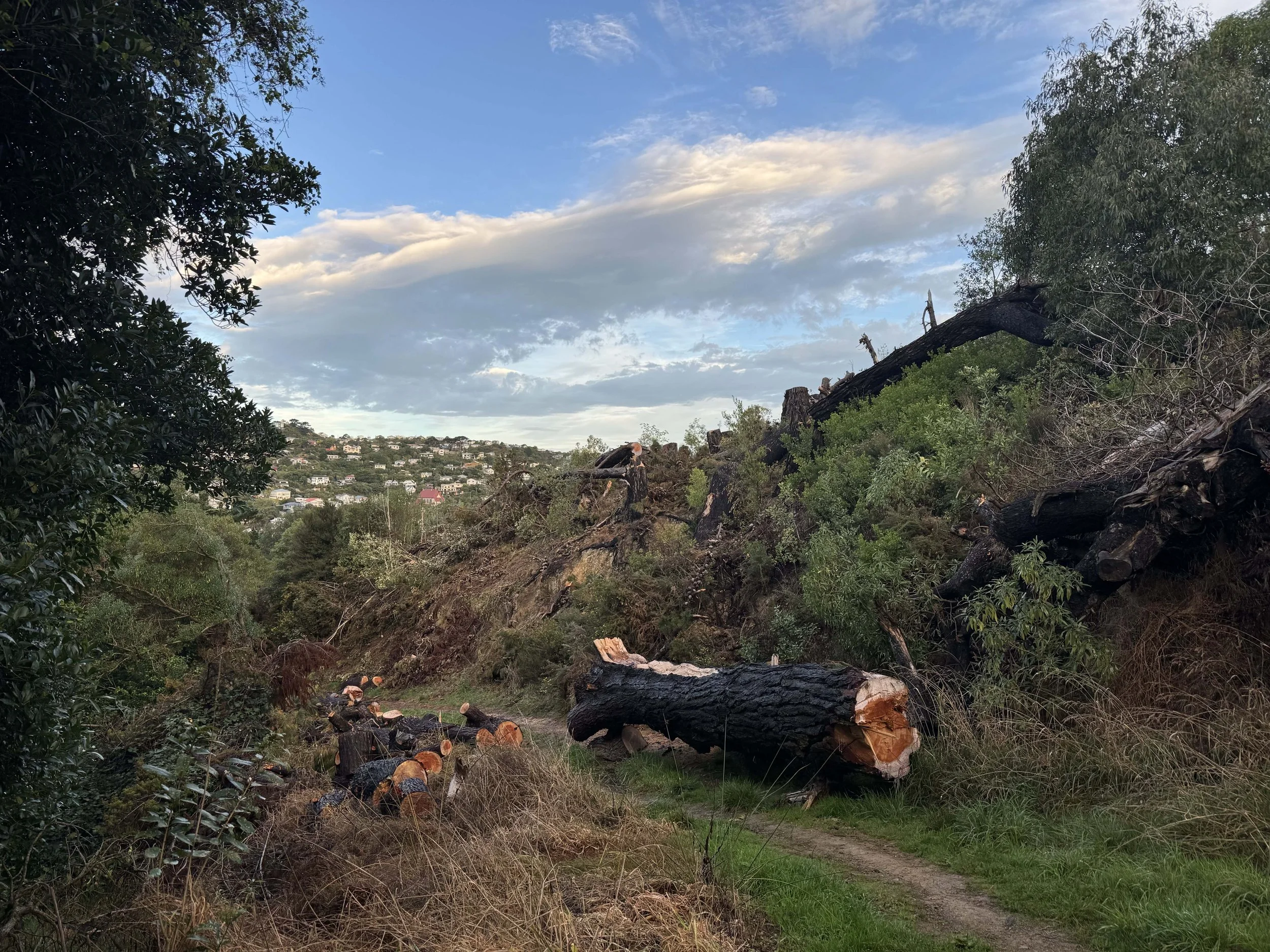 One of a number of trees that were blown over near Seed Source Gully. Trees are cleared by volunteers after storms.